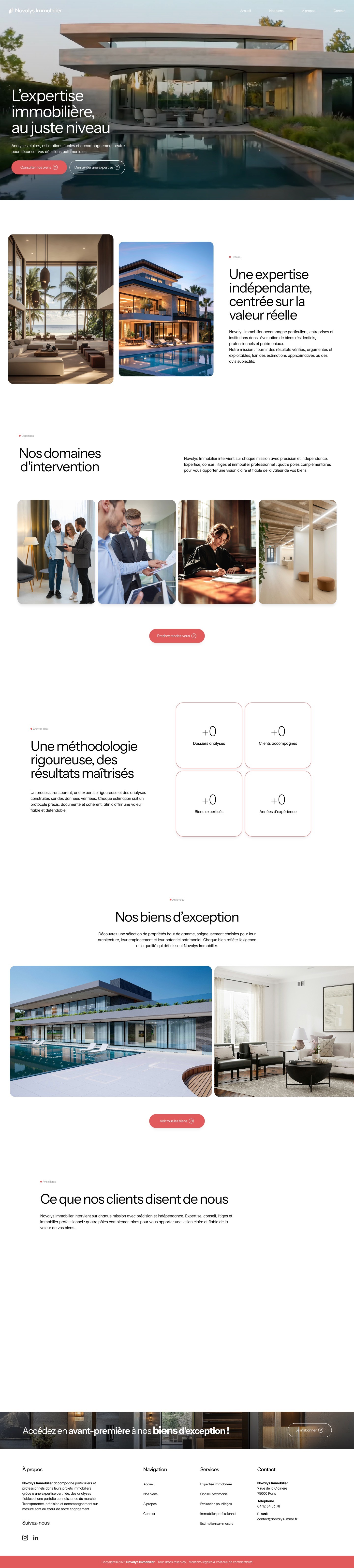 Intégration de sections clés : expertises, biens immobiliers, avis clients et formulaire de contact.